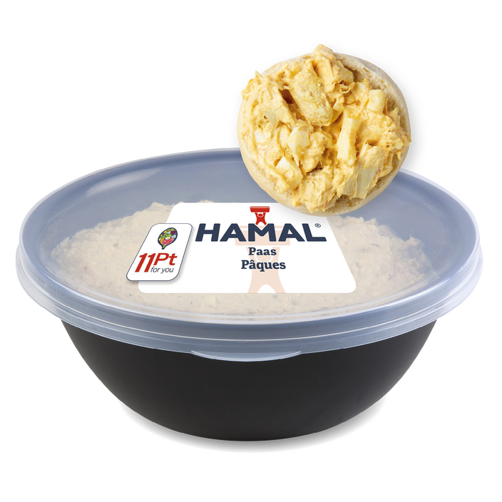 De heerlijke Paassalade combineert malse stukjes kip en gekookte eieren omhuld in een romige, licht pittige currysaus.