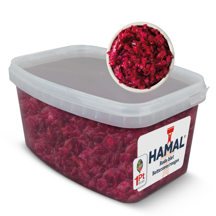 Onze rode bietensalade is vast een gesmaakte gast binnen je buffetsalades door de combinatie van rode bietjes, witte kool, ui, rozijnen, appel en veenbessen.